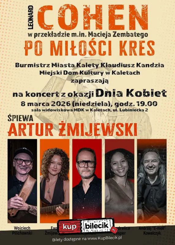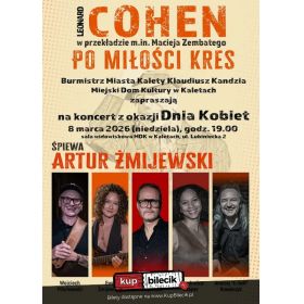 bilety: "LEONARD COHEN - PO MIŁOŚCI KRES". Arturowi Żmijewskiemu na scenie towarzyszyć będą wyjątkowi muzycy. Ewa Żmijewska (wokal, gitara), Shandrelica Casper "Shandy" intrumenty perkusyjne i wokal, Wojciech Pilichowski gitara basowa oraz wokal i Andrzej "E - moll" Kowalczyk śpiew, gitary i instrumenty klawiszowe. Razem tworzą niezwykłą muzyczną przestrzeń, która doskonale oddaje nastrój i przesłanie utworów Cohena. Cohen - Po miłości kres artyści: Artur ŻmijewskiProgram "Cohen - Po miłości kres" to nie tylko hołd dla twórczości Cohena, ale także nowa, pełna emocji interpretacja jego utworów. To koncert skłaniający do refleksji nad przemijaniem i wolnością jednostki, który z pewnością na długo pozostanie w pamięci. Bilety do nabycia na: KupBilecik.pl |